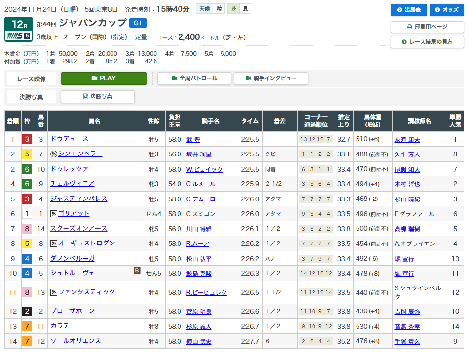 11月24日・東京12レース ジャパンカップ(GⅠ) 3歳以上オープン 芝2400m
