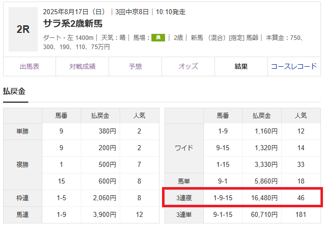 中京2Rの3連複フォーメーション予想28点です。