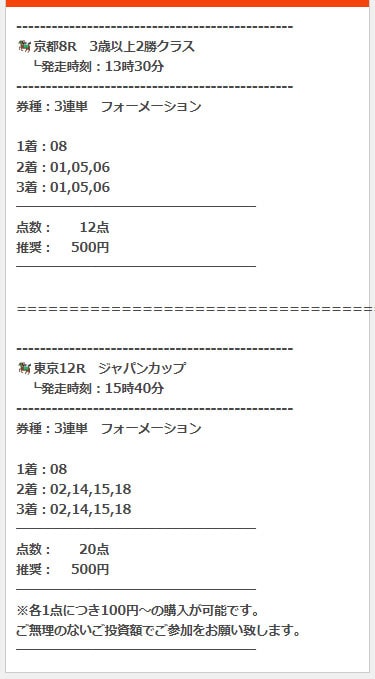 2日目【11月30日(日)】この日に公開されたのは残り2レース分の京都8Rと東京12RG1ジャパンC買い目でした。