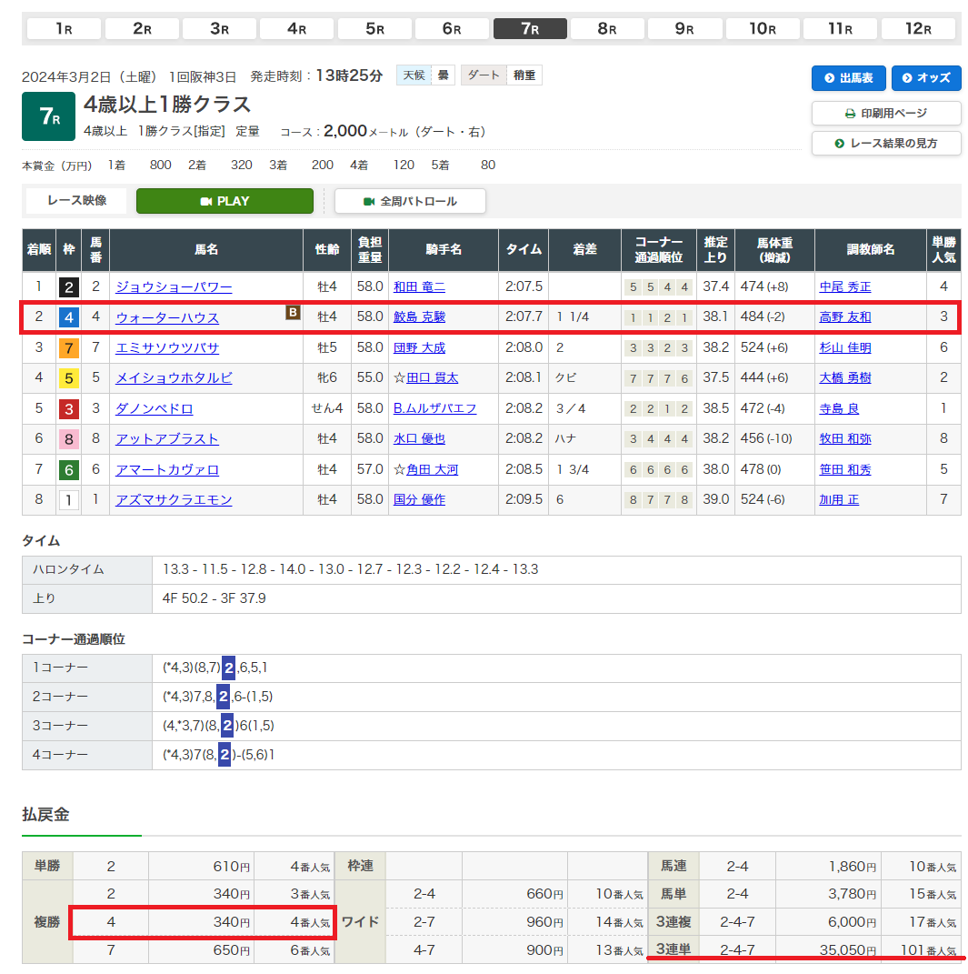 3月2日(土)阪神7Rで買い目点数1点的中!