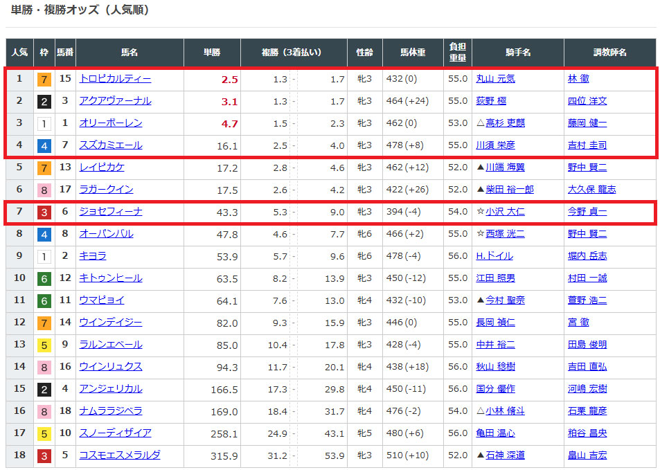 7番人気のジョセフィーナが馬券に絡めば、払戻しに期待が持てそうです。