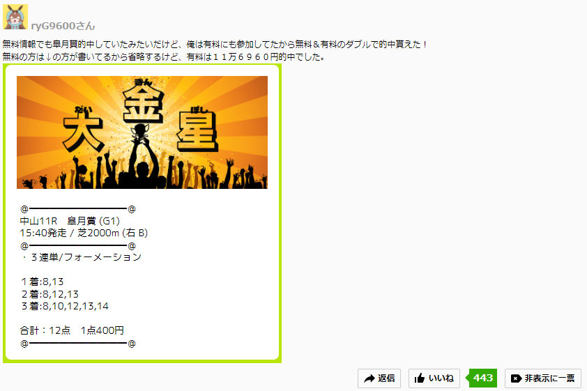 競馬リポート内の口コミにも無料情報と有料情報でダブル的中の報告がありました。
