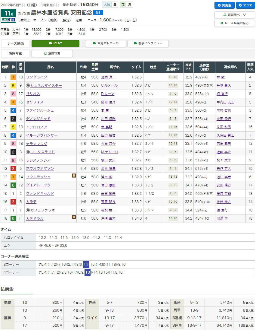 ですが昨日の本命は13番ソングライン、1位でゴールインして不敗神話に終止符が打たれた。