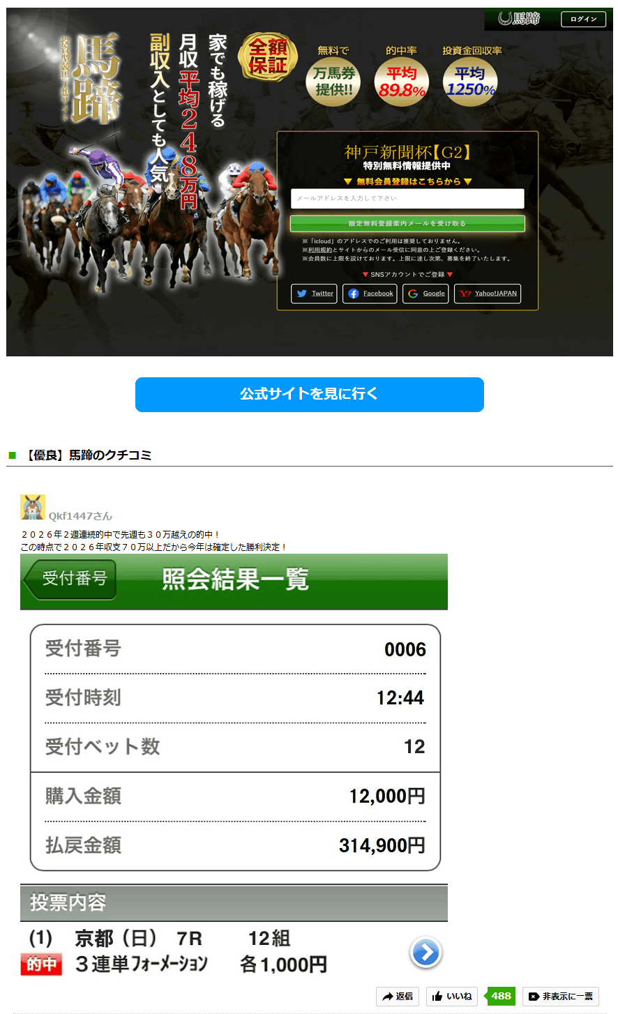 しかsも2026年2週連続的中報告もあり、継続して利用する事で着実に収支を上乗せする可能性があり見所十分!
