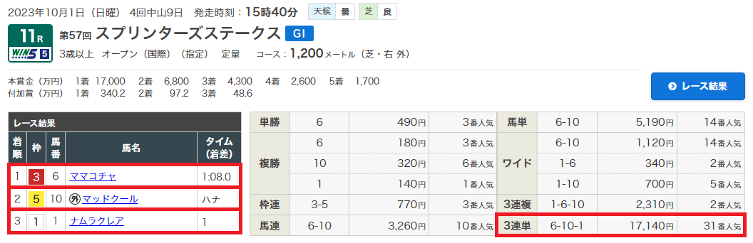 1日(日)スプリンターズS(G1)で無料情報3連単171.4倍的中!