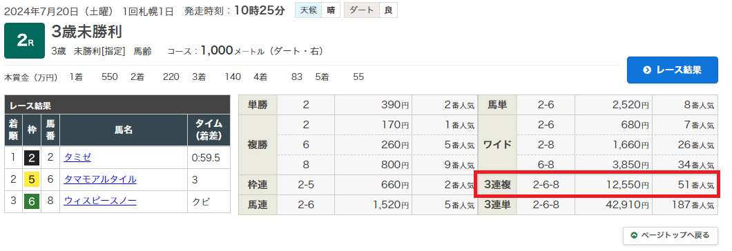 7月20日・札幌5レース 2歳新馬 ダート1700m