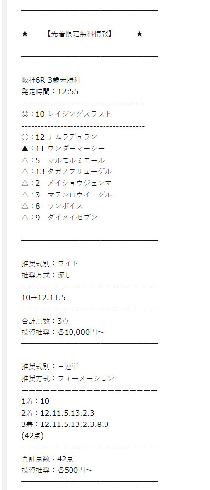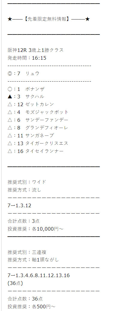 1点でコスパの良い予想してくれると思いつつ登録したらものすごい点数で大損してしまったということのないよう騙されないようお気を付け下さい。