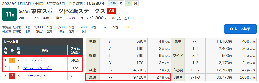 11月18日・東京11レース 東スポ杯2歳ステークス(GⅡ)2歳オープン 芝1800m
