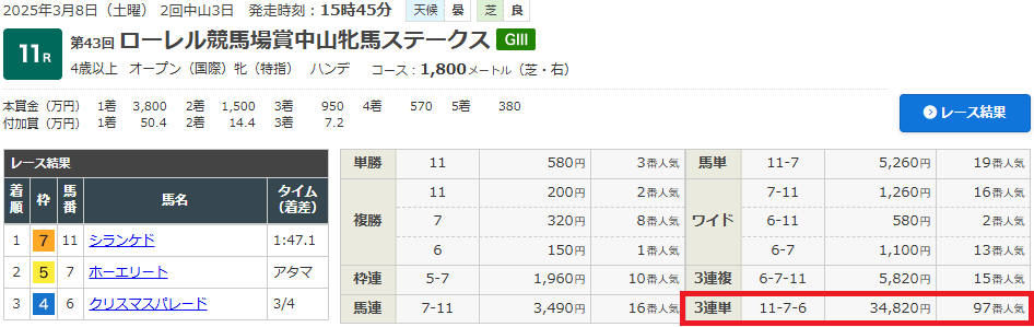 3月8日・中山11レース 中山牝馬ステークス(GⅢ) 4歳以上牝馬オープン 芝1800m