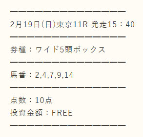 2/19(日)東京11RのG1フェブラリーSのワイド5頭ボックスです。
