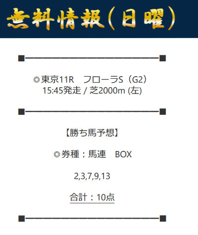 予想内容もしっかりしていて、無料予想でも馬連での提供は自信の現れである!