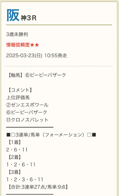 気を取り直して、次の日の日曜日に公開されていた買い目がこちらになります。