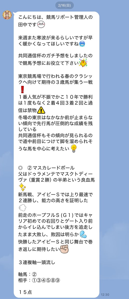 【LINE限定】管理人田中ガチ予想が共同通信杯(G3)的中!