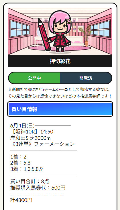 その日はポイントの情報がなかったのでポイントは使わず、色んな人の情報があったのですが、無料予想の馬券が当たった金額と同じような金額の38,000円で販売されていた「押切彩花」というプランに参加してみることにしました。