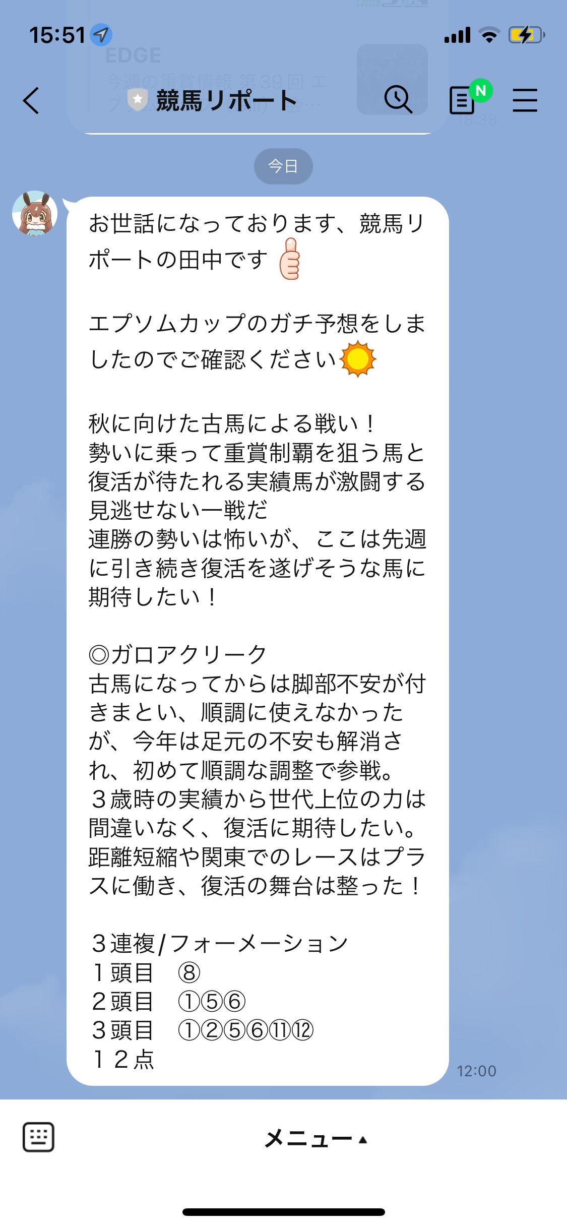 管理人の田中がガチ予想したエプソムカップ予想は3連複72.6倍の的中をお届けできました、ご参加された会員の皆様の参考になれて幸いです。