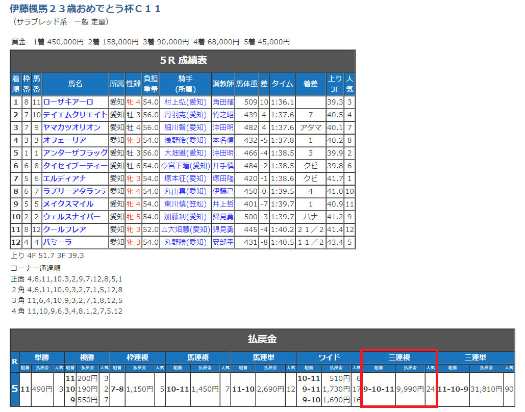 11月16日(木)名古屋5Rの三連複軸流し10点の予想
