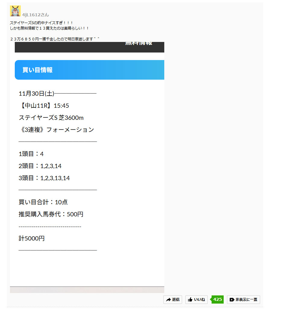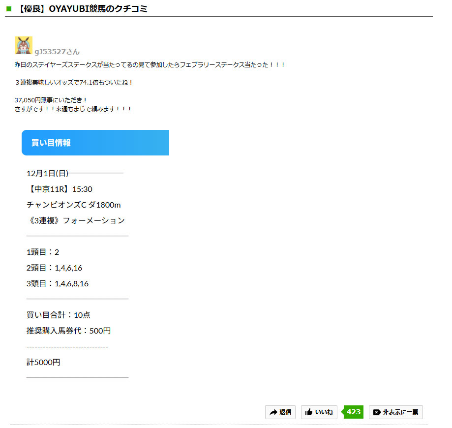口コミを見てみるとこの他にも多くの重賞や有料情報が的中しているようです!
