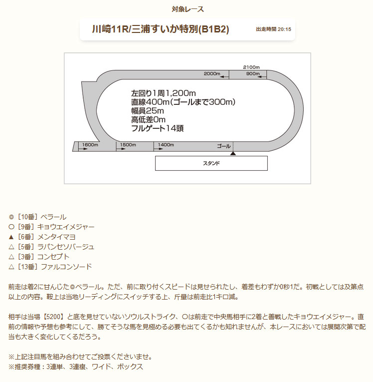 休日の中央競馬の平日も地方競馬の情報を公開しているようで今回公開されたのは平日に開催されていた川崎競馬の予想になります。