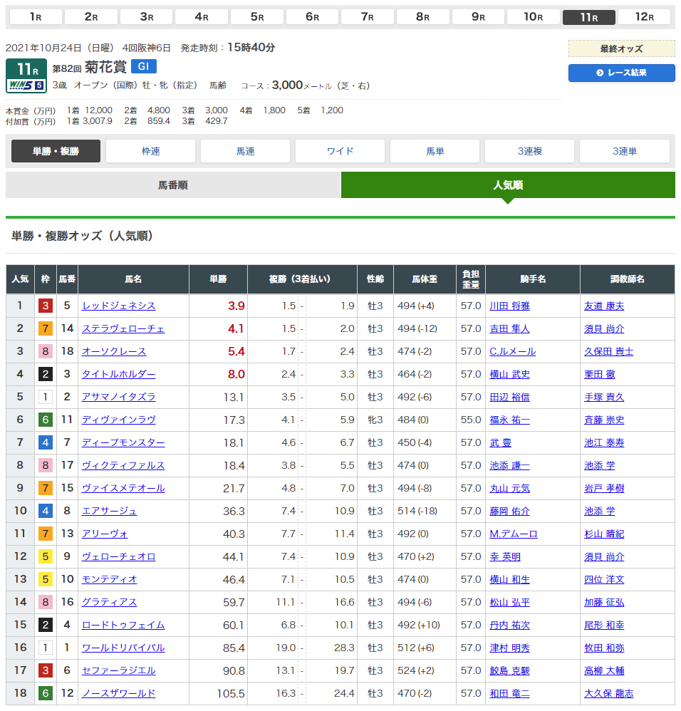 話がそれてしまいましたが菊のタイトルを手にしたのは逃げたタイトルホルダー、2着オーソクレース、3着はなんと牝馬のディヴァインラヴ。