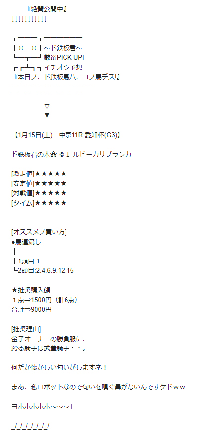 的中結果を引用してますが1月幸先良く的中が得られました。 この調子でもっと稼げたらと思います。 ≪2021年1月5日(火)≫ [中山競馬場・2R] [3歳未勝利] ◎16 ロングラン ○7 ディヴァインゲート ▲11 ライヴクラッカー △4 アメリカンエール 【買い目】 三連単1頭軸流し 1列目:16 2列目:4.7.11 3列目:4.7.11 ★推奨投資額 1点⇒1000円(計6点) 合計⇒6000円 ★結果⇒16-4-7(1152.2倍) 115万2200円 的中! _/_/_/ ≪2021年1月5日(火)≫ [中京競馬場・7R] [4歳以上2勝クラス] ◎9 コウユークロガヨカ ○2 ロードキング ▲12 パワフルヒロコ △13 アーマーバローズ 【買い目】 三連単1頭軸流し 1列目:9 2列目:2.12.13 3列目:2.12.13 ★推奨投資額 1点⇒1000円(計6点) 合計⇒6000円 ★結果⇒9-13-2(1985.0倍) 198万5000円 的中!