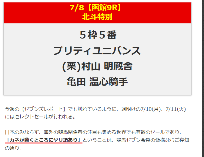 6月25日まで会員なのに、函館情報は、別情報料支払った方のみ提供。 私にはとても支払えない情報料金。大々的に函館でも「的中」を出した。 皆さんは、このような営業方針、どう思いますか? 貧乏人には「別次元」