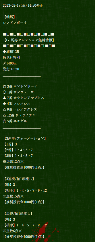 3-5-4で3連単442,700円、3連複125,300円、馬連29,300円でトータル597,300円も当たりました( ゚Д゚) マジでしびれました 浦和ってそんな荒れるイメージなかったですがやばいっすね!!!!