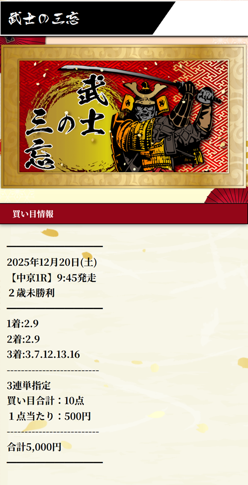まさか朝一のレースだとは思わず締め切り1分前に滑り込みで馬券購入! まじで焦ったけどこの行動力が3連単高配当的中に繋がった! 16頭だての13人気が猛烈な末脚で馬券入ってきて985.3倍的中! 馬券代5000円、軍資金が約100倍の49万2650円になりました。 有馬記念ゼンツ&丸乗りするからまじで頼んだ!!
