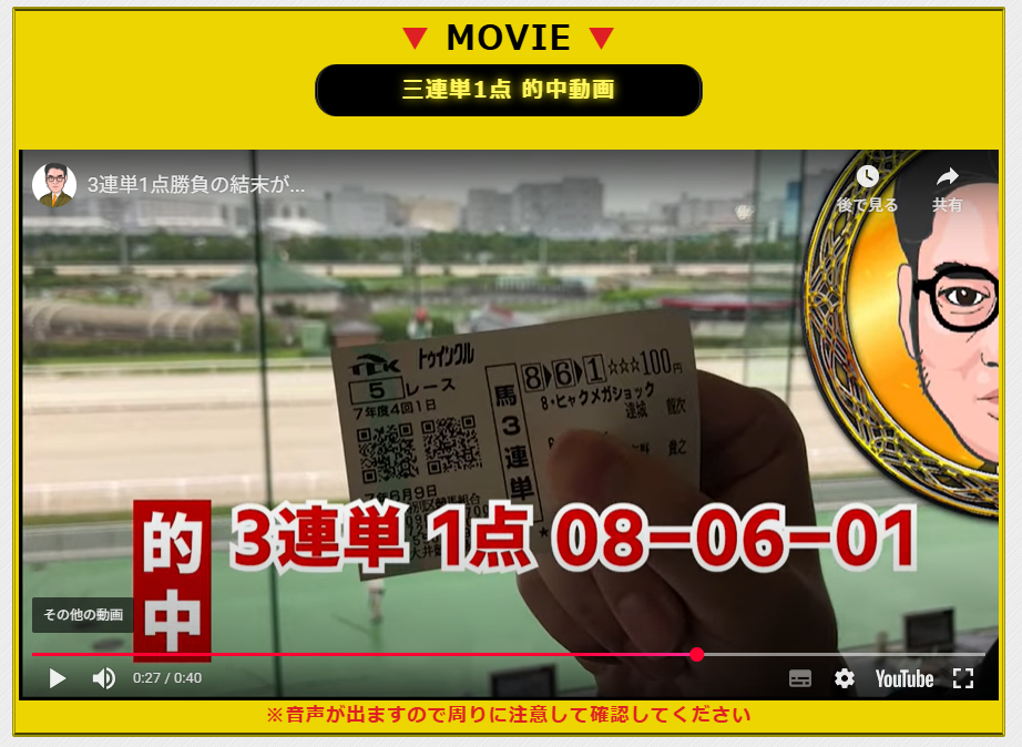↓の口コミ見て気になって登録したら色々動画ありました、これはまた別の動画なんですけど3連単1点予想ってちょっと強過ぎん? 的中サークルしか勝たんな!