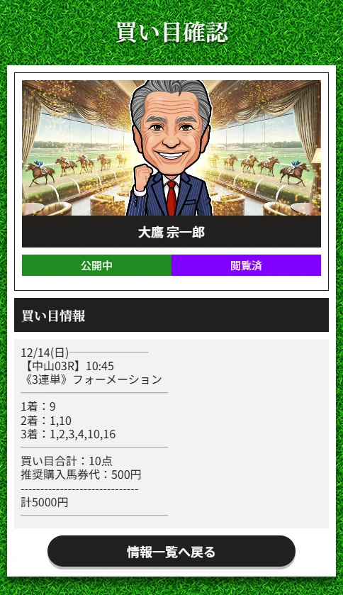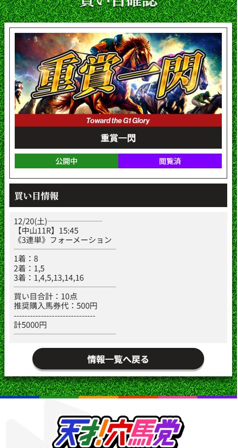 難しいハンデ重賞戦的中あざっした! 明日G1資金が貯められました、57,700円の配当でした! 明日も重賞無料で出るよね?楽しみにしています!